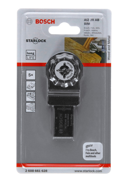 Das Tauchsägeblatt Starlock AIZ 20 AB ermöglicht Feinschnitte in Holz und ungehärtetes Metall. Das schmale Blatt von 20 mm Breite ermöglicht Filigranarbeit. Das robuste Starlock-Aufnahmesystem reduziert Lateralschwingung des Blattes und ermöglicht mittels direkter Kraftübertragung haarfeine Schnitte. Es wird verwendet für das Sägen von Aussparungen in Möbelbauteile, bündiges Ablängen von Kupferrohren und Tauchschnitte in Gipskartonplatten. Dieses Blatt sägt Holz und ungehärtetes Metall, weiche Kunststoffe und Paneele mit Kunststofflaminierung. Die Bimetallverbindung aus Blatt aus HCS-Stahl (Stahl mit hohem Kohlenstoffgehalt) und Zähnen aus HSS-Stahl (Schnellarbeitsstahl) ist verschleiß- und hitzeresistent und gewährt dem Blatt beim das Schneiden von ungehärtetem Metall und abrasivem Material eine hohe Lebensdauer. Das Starlock-Aufnahmesystem ermöglicht ‌einen schnellen Blattwechsel ohne Blattberührung in drei Sekunden.‌ Das Aufnahmesystem ermöglicht durch seine dreidimensionale enge Passung maximale Kraftübertragung zwischen Maschine und Zubehör.