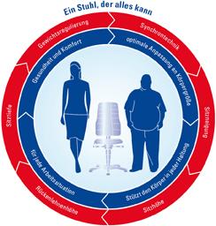 Dieser Arbeitsdrehstuhl ist ein Multitalent. Mit seiner Vielfalt an Einstellungsmöglichkeiten eignet er sich unter anderem für Industrie, Werkstatt, Büro, Health Care, Forschung und Entwicklung.