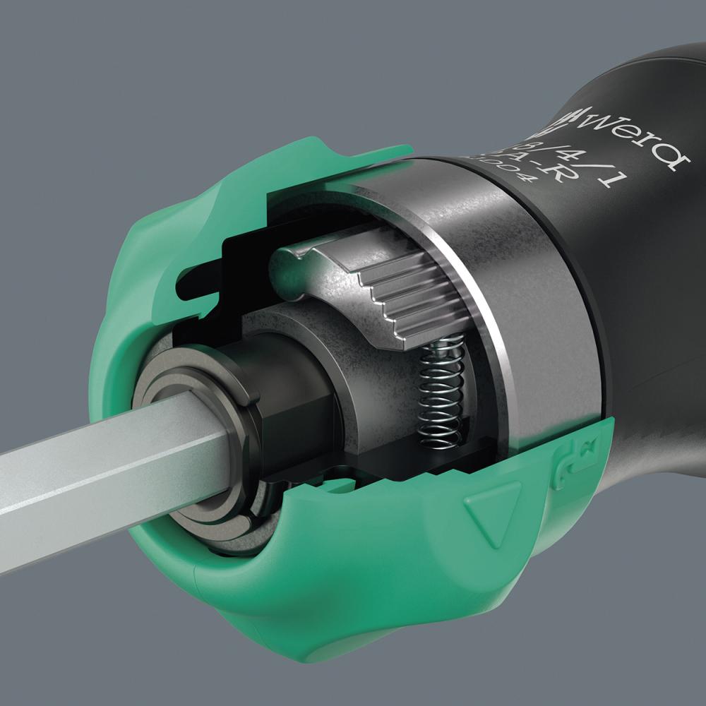 Bit-Magazinhalter Kraftform Kompakt 20 RA-R, 6-teilig • Ratsche mit Feinverzahnung und Zwirbelfunktion • Rechts-/Linkslauf, mit Mittelstellung, Umstellung in Schraubrichtung für intuitive Bedienung • Mehrkomponenten-Kraftform-Griff • Sechskant-Abrollschutz • Entnehmbare Bajonett-Verlängerung • Rapidaptor-Schnellwechselfutter mit Dauermagnet • Passend für Bits mit Sechskant-Antrieb nach C 6,3 und E 6,3 • Take-it-easy-Werkzeugfinder mit Farbkennzeichnung nach Profilen und Größenkennzeichnung Lieferung: Mit Gürteltasche. Tasche mit Klettzone und Gegenklettstreifen zur Befestigung. Inhalt: 1 Bit für Schlitz-Schrauben 0,8 x 5,5 mm 2 Bits für Kreuzschlitz-Schrauben PH 1; PH 2 1 Bit für Kreuzschlitz-Schrauben PZ 2 2 Bits für TORX-Schrauben T 20; T 25 Hersteller: Wera Werkzeuge GmbH, Korzerter Str. 21-25, 42349 Wuppertal, DE, +4920240450, sales@wera.de
