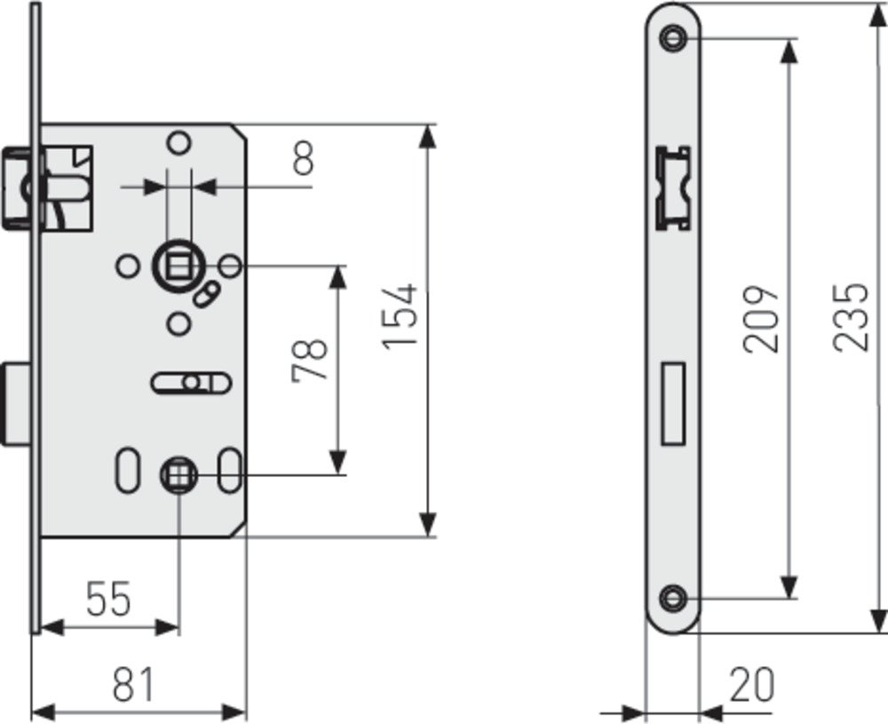 UNIVERSELLES EINSTECKSCHLOSS Beim Zuziehen der Tür wird ausschließlich die Falle betätigt. Durch Verschließen mittels WC- und Badriegel wird der Riegel ausgeschlossen (eintourig).