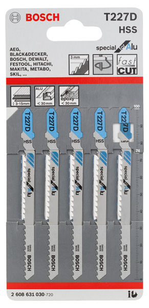 Herausragende Lebensdauer beim Schneiden von Aluminium! Hochgeschwindigkeitsstahl (HSS) für Festigkeit und Hitzebeständigkeit Du bist Metallarbeiter und benötigst ein langlebiges Stichsägeblatt für Kurvenschnitte in Aluminium und Nichteisenmetalle? Dann ist das PRO Alu curve T227D die richtige Wahl. Wir haben es entwickelt, damit du Werkstücke mit einer Dicke zwischen 3 und 15 mm schneiden kannst – immer und immer wieder. Das PRO Alu curve T227D Stichsägeblatt ist eine großartige und langlebige Ergänzung für jede Metallwerkstatt, in der Kurvenschnitte in Aluminium durchgeführt werden müssen. Es wurde aus Schnellarbeitsstahl (HSS) hergestellt, um die Stabilität und Hitzebeständigkeit zu gewährleisten, die du beim Schneiden von Aluminium und anderen Nichteisenmetallen benötigst. Wir haben es mit gefrästen, geschränkten Zähnen und ovalen Spanräumen versehen, um einen gleichmäßigen Schnitt zu gewährleisten. Schneide damit Aluminiumbleche mit einer Dicke von 3 bis 15 mm, Rohre und Profile mit einem Durchmesser von bis zu 25 mm.